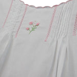 Featuring heirloom-quality handcrafted details like pintucks and open work embroidery, this piece is sure to become a treasured keepsake. A simple yet sweet embroidered flower design and a scalloped edge adds the perfect finishing touch.