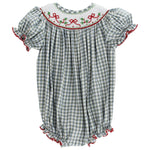 Made from classic green and white gingham, this sweet Gingham Bishop Short Romper features beautifully hand-smocked red bows and holly across the neckline, creating a festive, heirloom-inspired design. Gently puffed sleeves and elastic leg openings trimmed in red stitching add playful detail and all-day comfort. The bishop-style silhouette allows for a relaxed, elegant fit, perfect for celebrating the season in style. Whether it’s for holiday photos, family gatherings, or Christmas morning, this romper is a timeless piece full of charm and cheer.