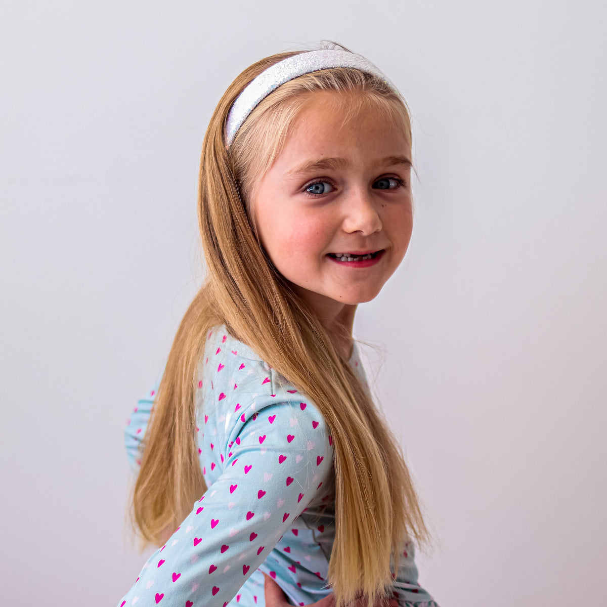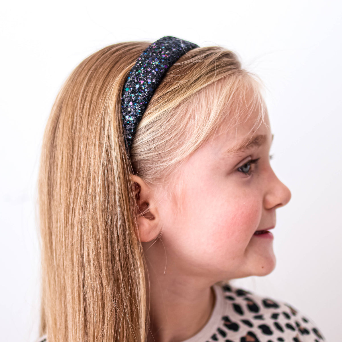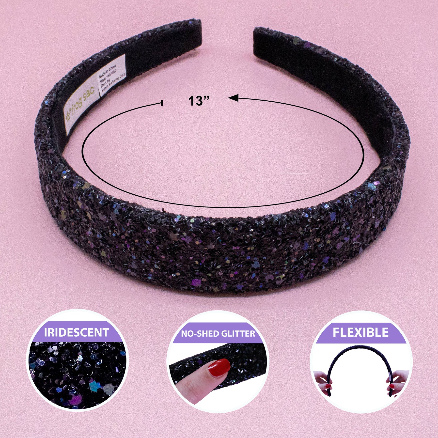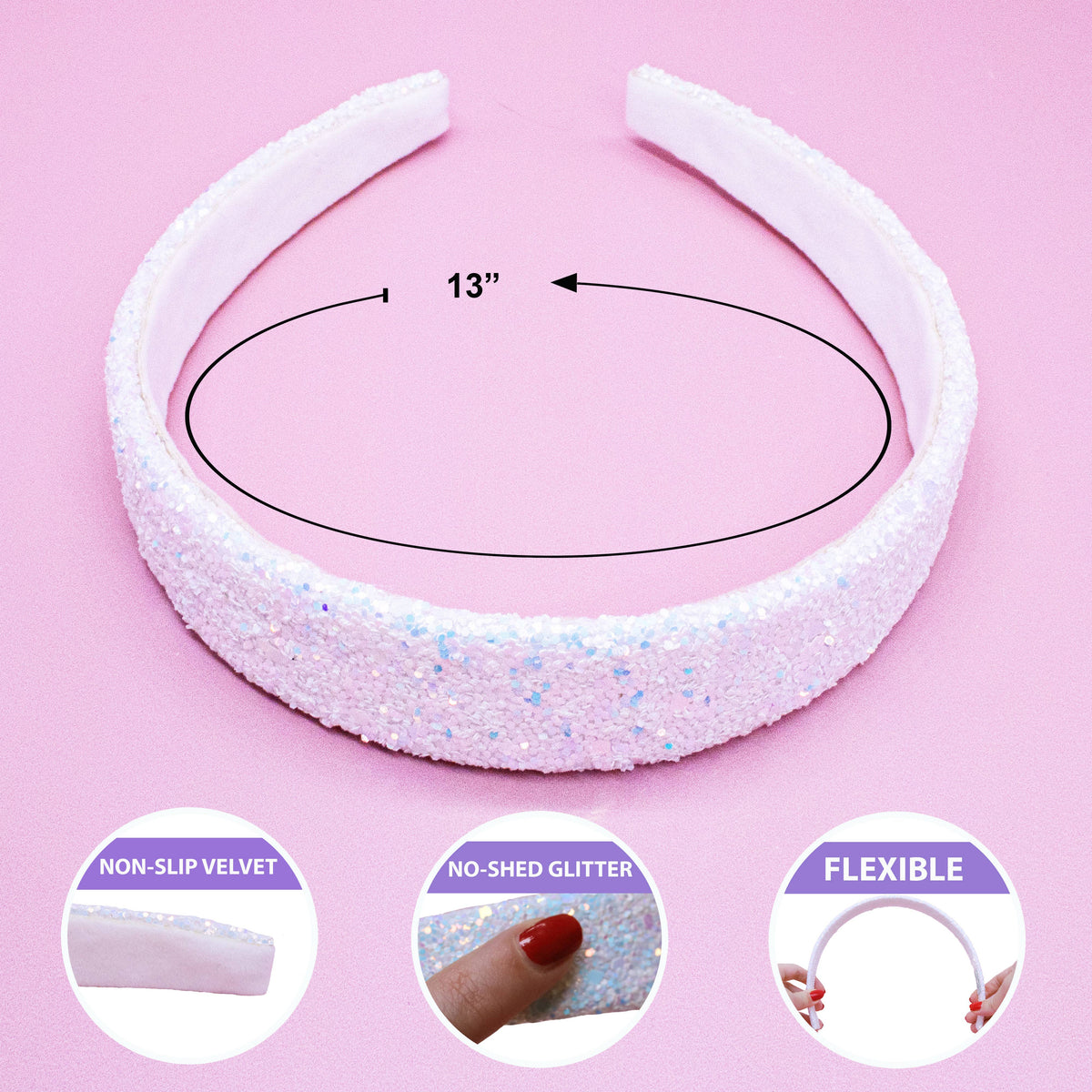 * Chunky iridescent glitter headband * Colors - white, black, gold, pink, or rainbow * Flexible 13" size to best fit kids to tweens * 1" width at the top, tapered down to 1/2" width at the bottom * Sparkly bold statement hair band One of our most popular styles for children's boutiques, kids' hair salons, and gift shops. The perfect shimmering headbands for girls who want to look fashionable at school, hanging with friends, or just relaxing at home. Choose between a variety of colors to mix and match with your favorite outfits.