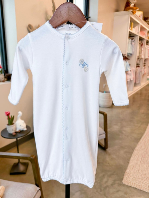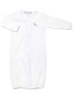 The baby boy converter gown with hand embroidered blue heirloom rattle is made from 100% Peruvian Pima cotton. The gown snaps from the neckline to foot for easy dressing and changing and the elastic hem allows this gown to be converted to a playsuit.