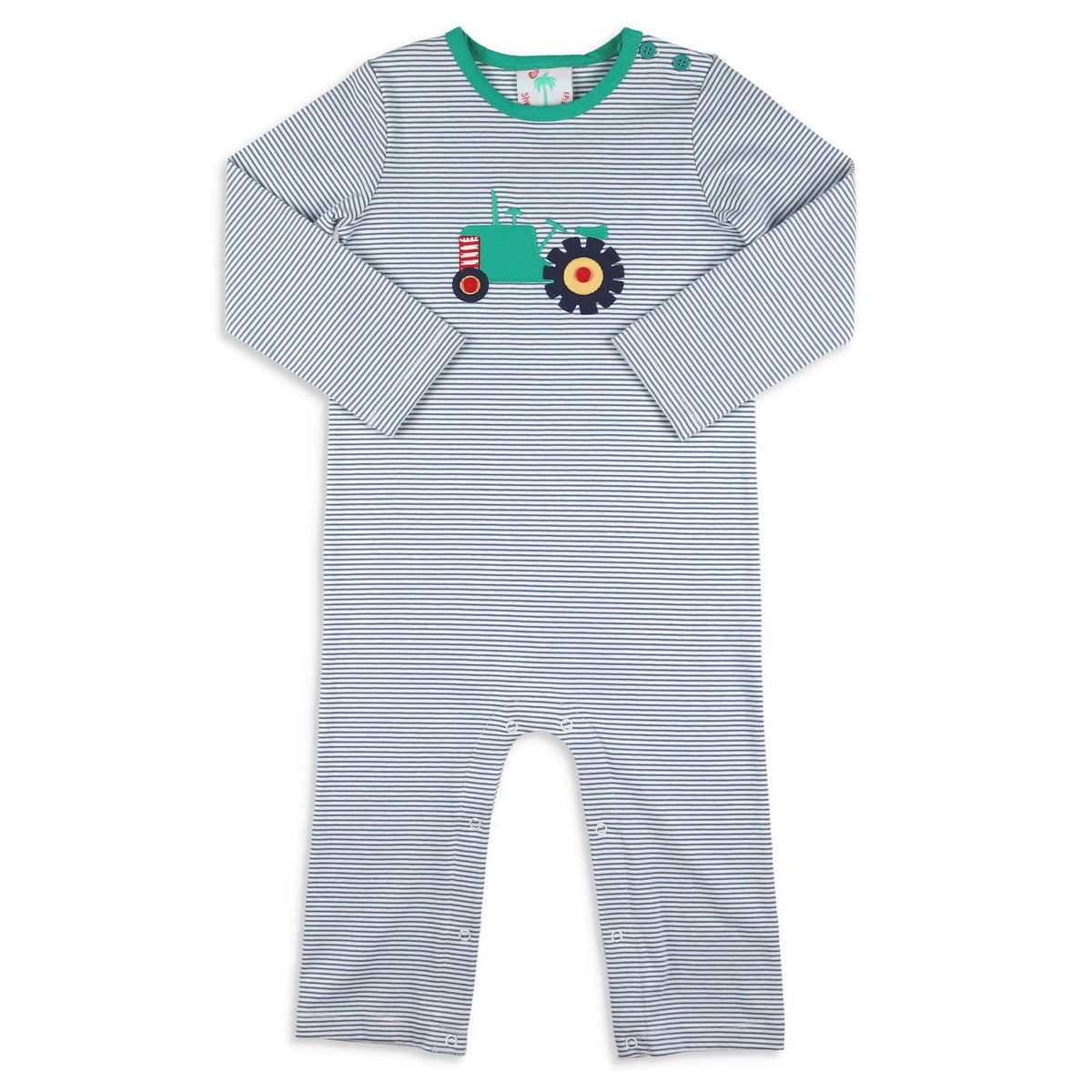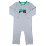 This sporty style, versatile romper, features green and white striped cotton knit fabric, a green banded collar, custom green buttons at the shoulder, long sleeves, and a vintage tractor, appliqued across the front, all creating that special retro look.