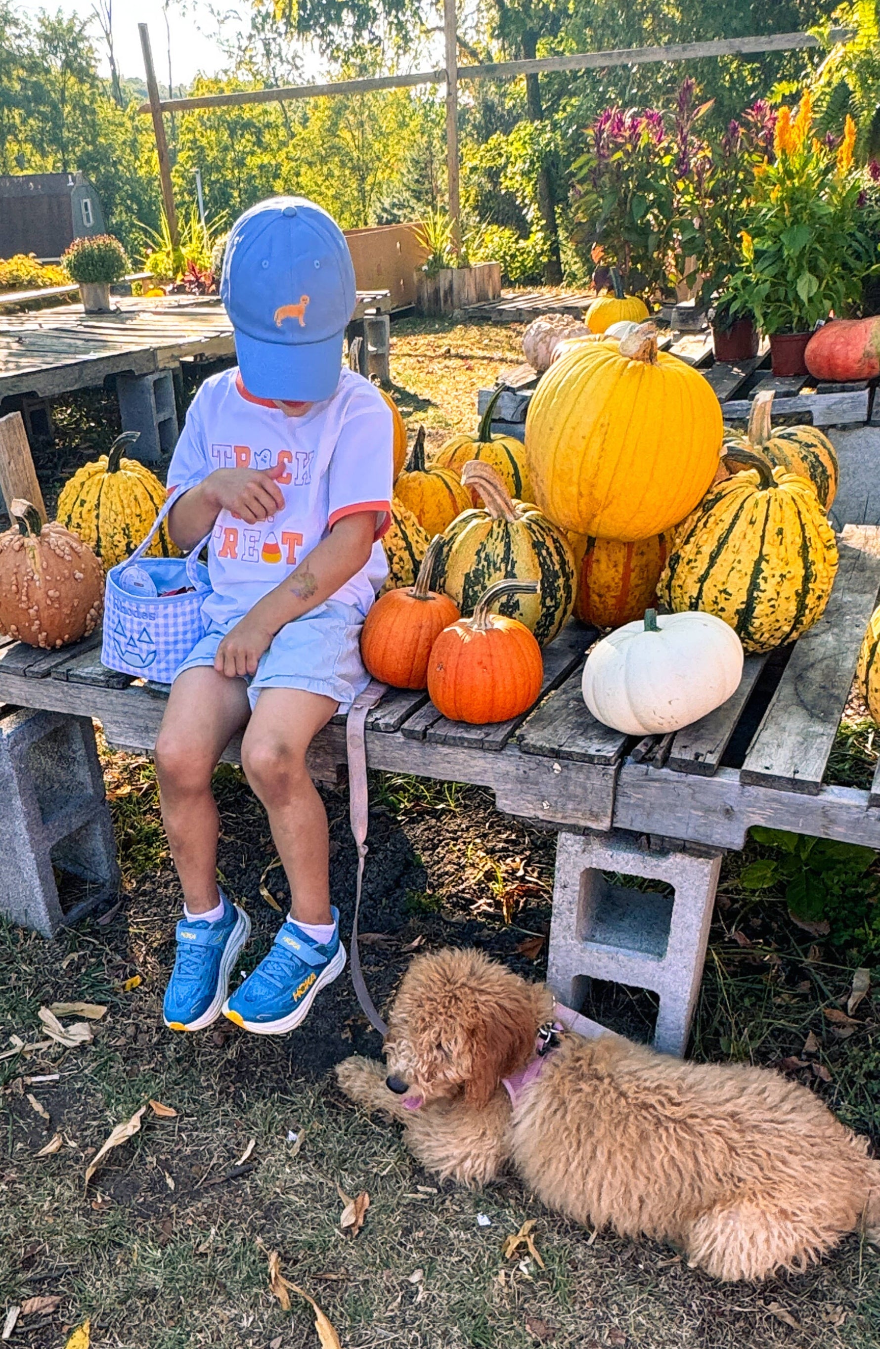 A playfully polished blue baseball hat with golden retriever dog embroidery and blue seersucker tuckstrap.