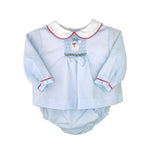 This long sleeve diaper set comes with light blue shirt with a Santa hand picture smocked insert and red trimmed edges. A matching light blue diaper cover completes the look.