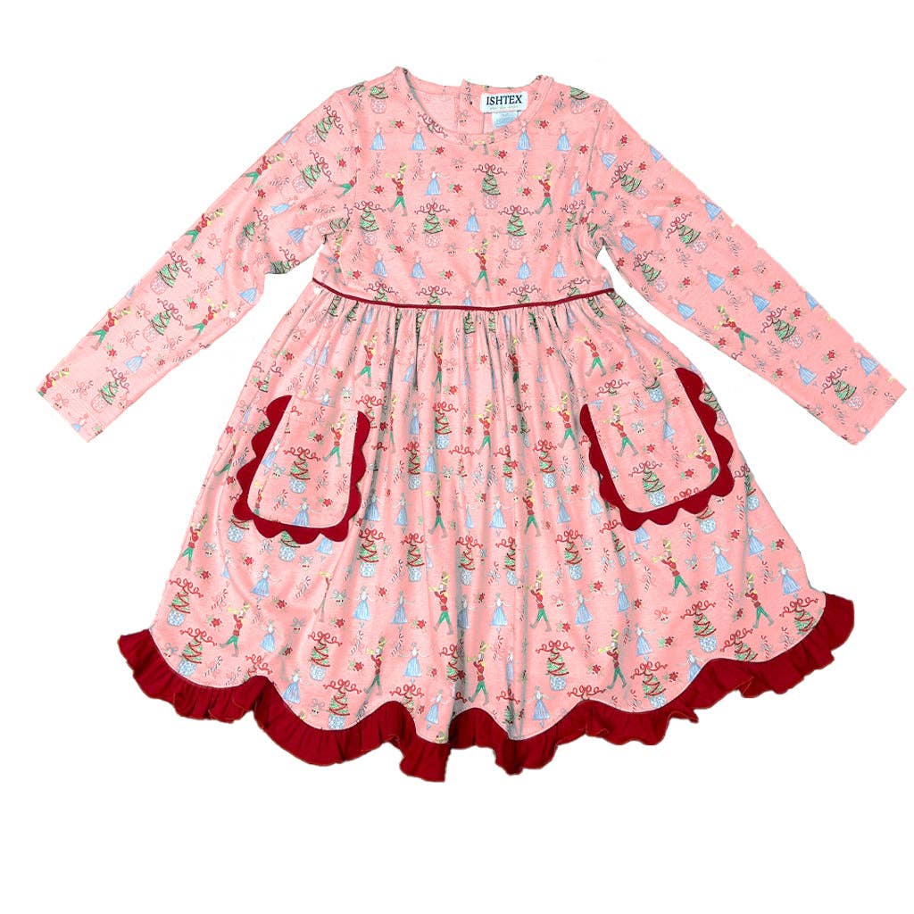Twirl into the holiday season with our Nutcracker Pocket Dress! This long-sleeved pink dress features a delightful print of toy soldiers, ballerinas, and festive ribbons, all trimmed in deep red corduroy along the scalloped pockets and hem. A gathered waist gives it the perfect amount of twirl, ideal for little girls who love to spin.