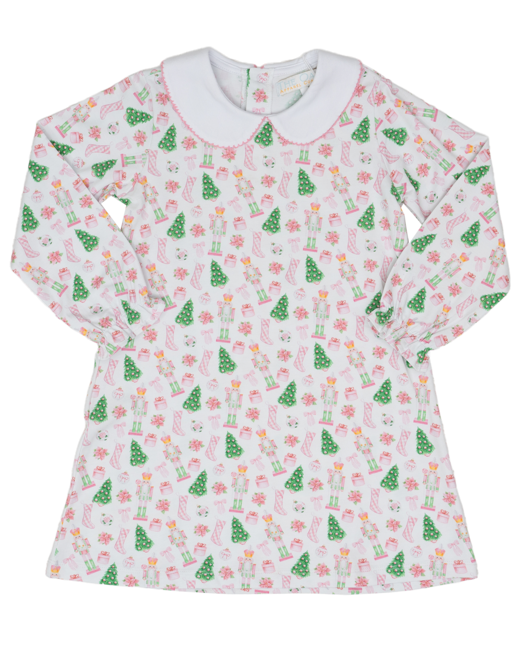 Get ready for the the holiday season with our Presley Kait Preppy Christmas Long Sleeve Dress! Made from soft pima cotton, this pastel pink dress is adorned with nutcrackers and trees for a fun, preppy Christmas look. Complete the sister set with our Mary Charlotte and Mary Reese pieces for the ultimate festive outfit! We recommend washing on gentle and laying flat to dry.