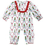 This sweet Topiary Romper is full of festive charm, featuring a graceful allover print of green topiaries tied with red holiday bows. The gathered neckline is framed by a scalloped red trim that adds just the right touch of contrast. Gently elasticized wrists and legs create a comfortable fit while keeping the silhouette classic. Crafted from a soft and breathable 95% cotton / 5% spandex knit, this bubble combines everyday comfort with timeless Southern style. Perfect for holiday gatherings and portraits, it’s a cheerful, heirloom-inspired look that little ones can wear comfortably all season long.