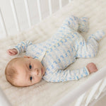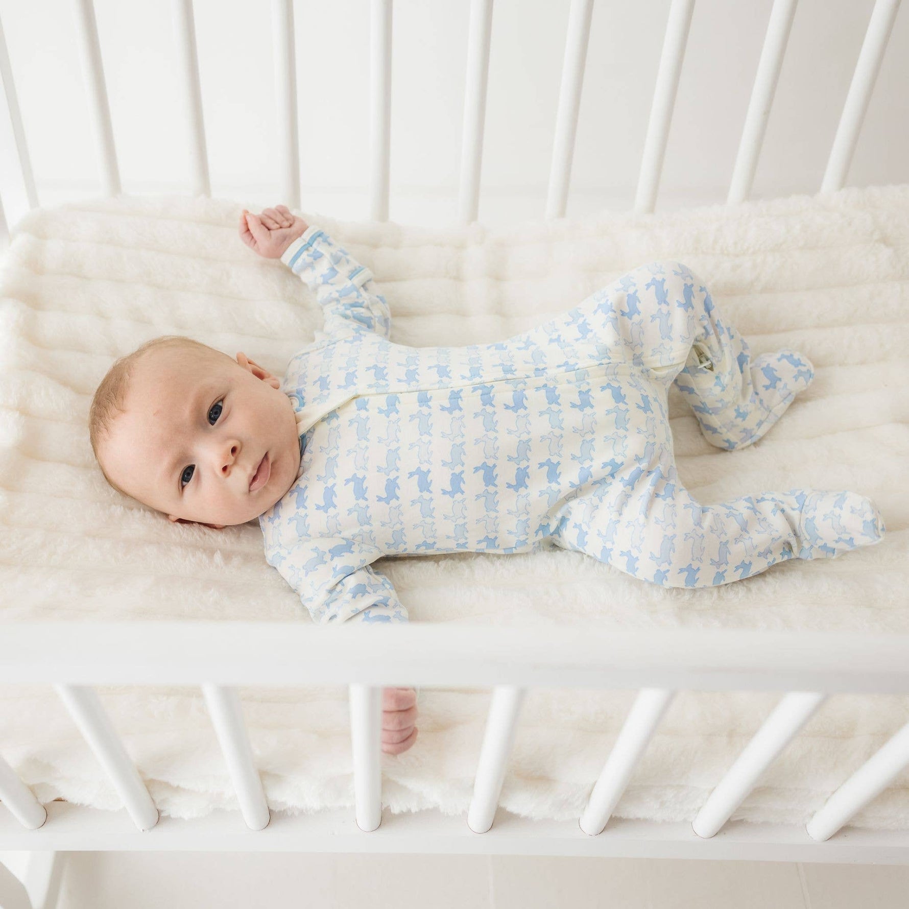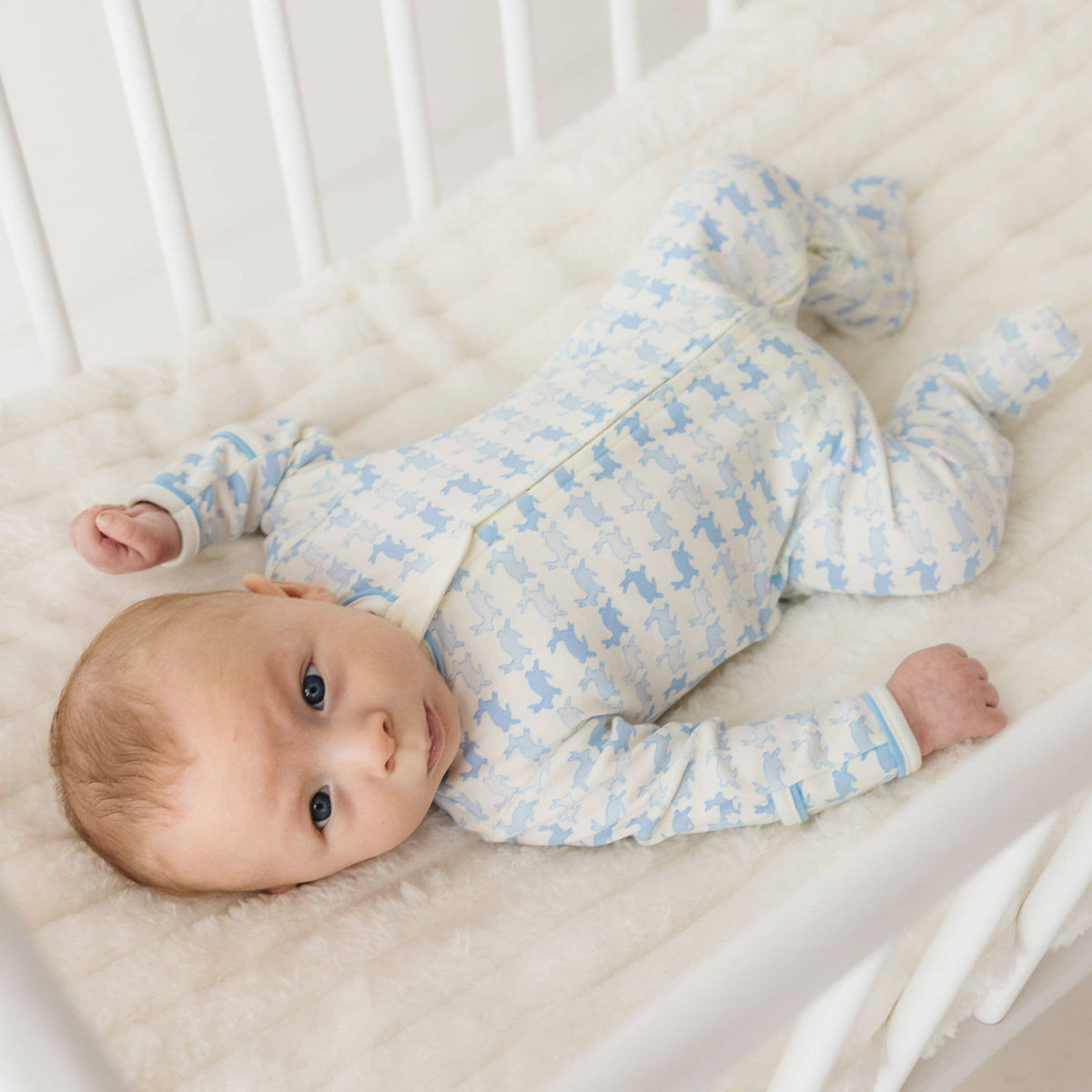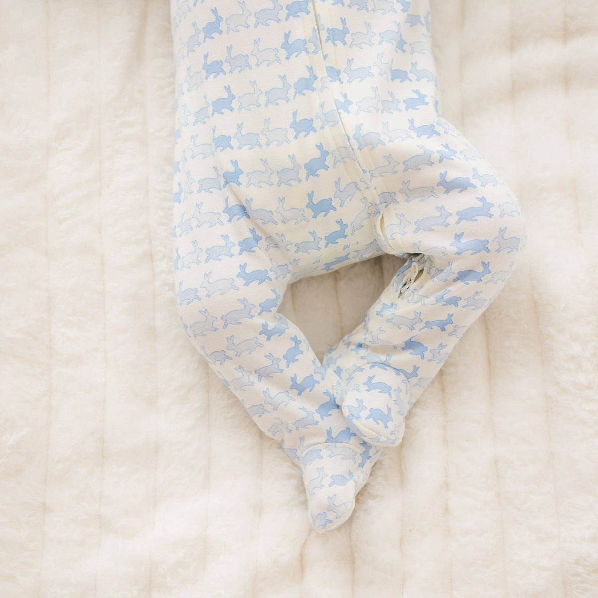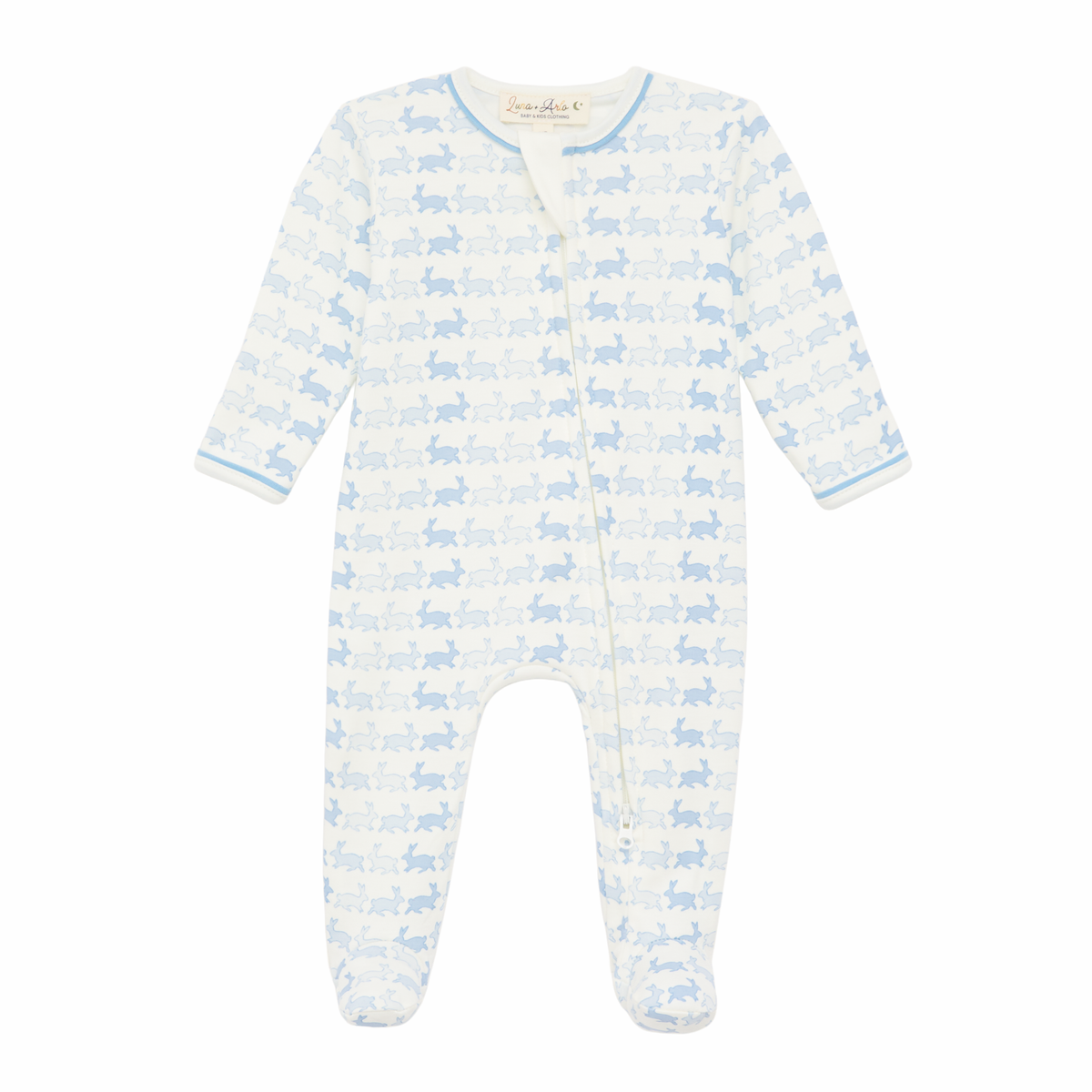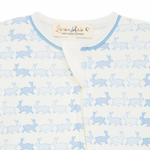 * Coordinates with other items in the Bunny Hop Collection * Print * 100% Pima Cotton * Made in Peru * Machine Washable * Two-way zipper allows for easy diaper changes without completely undressing baby