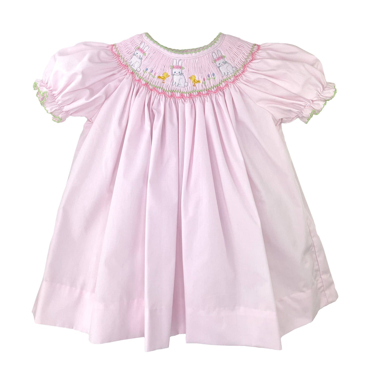 A traditional Easter outfit that is perfect for going to church, hunting for Easter eggs or family photos. This short sleeve dress comes in a solid pink fabric with bishop smocking with an Easter themed picture smocked design with bunnies, chicks and flowers. This dress comes in a cotton-poly blend fabric that is light weight and machine washable for easy care. Matching bloomers are included on sizes 3 months through 24 months only.