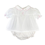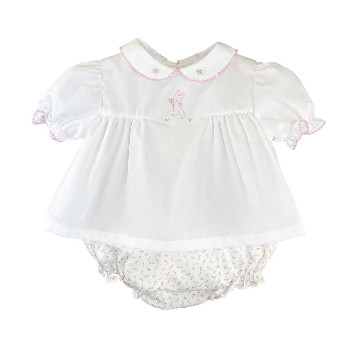 This simple yet sweet diaper set features a shadow stitched bunny design on the front with a peter pan collar and matching pastel floral print bloomers! A delicate trimmed edge adds just the right amount of details.