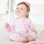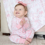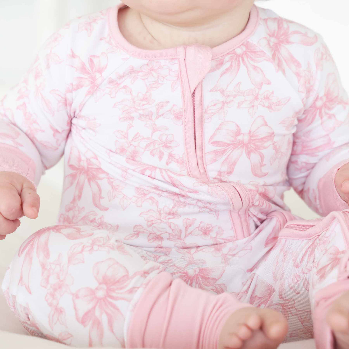 Drift off in dainty style with our Fancy Frills Convertible Zip Romper Pajama—the perfect blend of dreamy comfort and vintage charm. Made from buttery soft bamboo fabric, this one-piece pajama features a pink and white toile print with delicate bows and floral details for a look that’s as feminine as it is cozy. Designed to grow with your baby girl, this romper includes convertible footies and fold-over mittens, giving you two outfits in one and keeping little hands and feet warm (or cool!) as needed. The double zipper makes diaper changes quick and easy—especially during those sleepy nighttime moments. The breathable bamboo fabric is ultra-gentle on sensitive skin, making it ideal for both nighttime snuggles and daytime play.