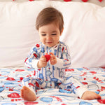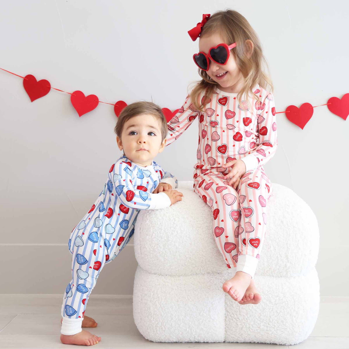 Our Sweet Like Candy Convertible Zip Romper mixes sweet conversation hearts with classic blue stripes, creating a love letter in its coziest form. Made with buttery soft bamboo fabric, it's a warm snuggle that stretches comfortably for every scoot, crawl, and cuddle. The convertible footies effortlessly switch from playtime to naptime, and the double zipper makes changes easier than ever. Perfect for Valentine’s parties, ph