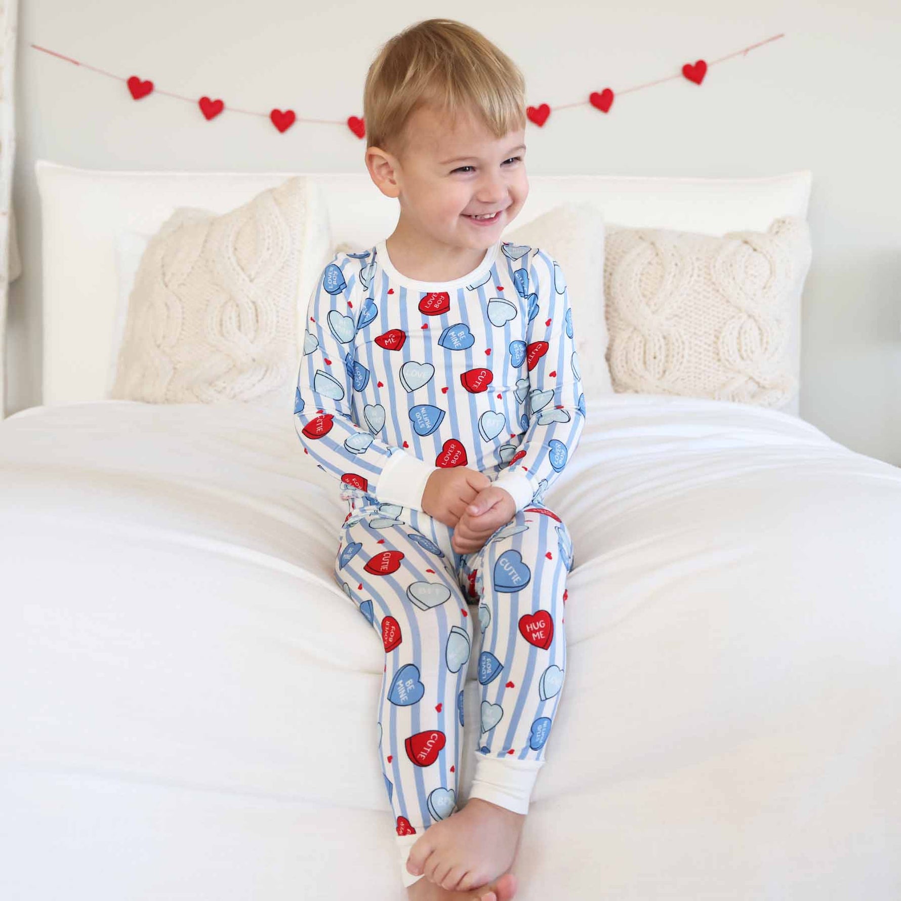 Give your little lovebug the sweetest Valentine’s Day dreams with our Sweet Like Candy Two-Piece Pajama Set! This adorable set is sprinkled with candy hearts and bold blue stripes, making it look like it came straight out of Cupid’s candy shop. The buttery soft bamboo fabric feel nice and cozy, and the stretchy fit keeps up with every sugar-high. Perfect for movie nights, Valentine’s parties, and mornings that start with heart-shaped pancakes, this set was made for all the sweetest moments.