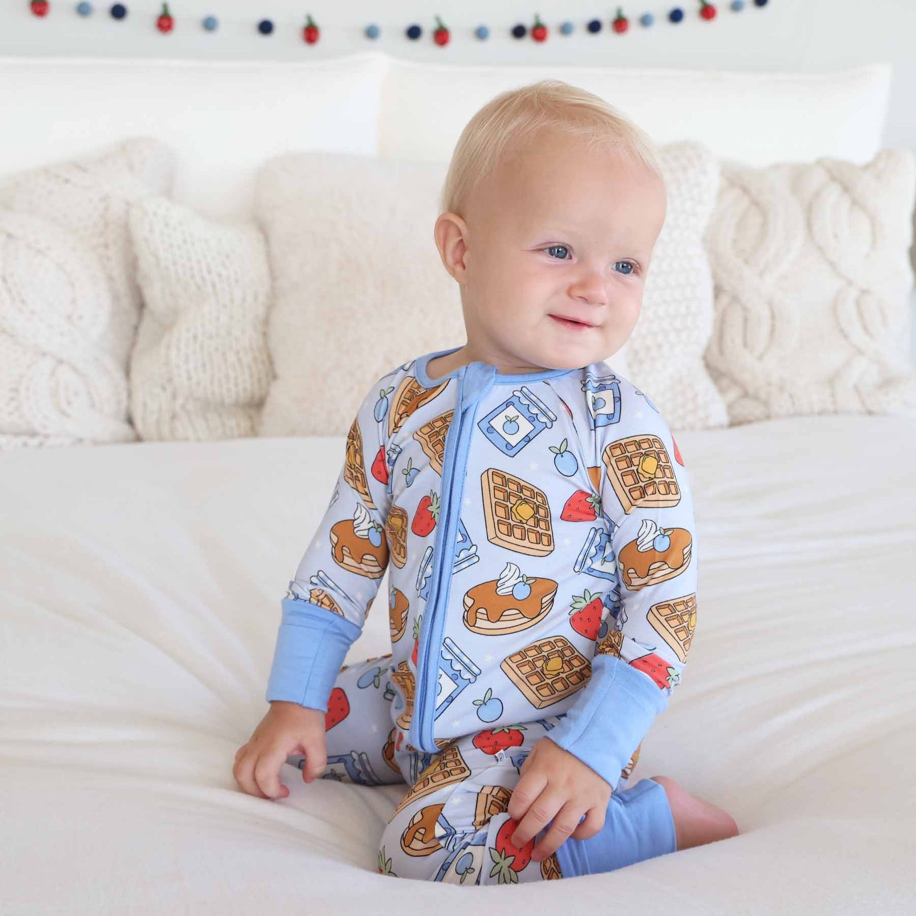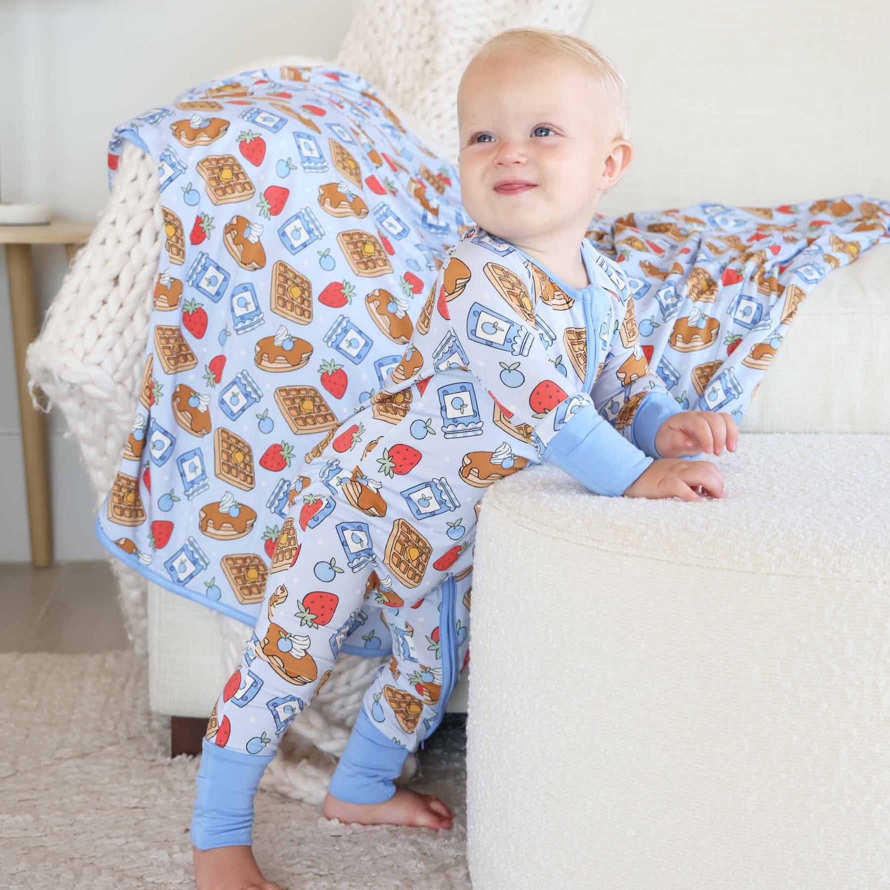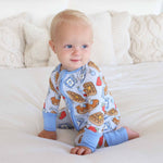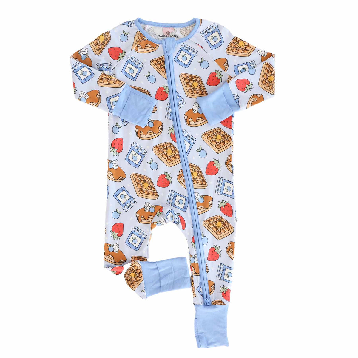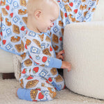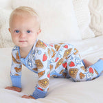Stack up the snuggles with the Sweet Stacks Blue Convertible Zip Romper! Sprinkled with fluffy pancakes, golden waffles and jars of jam, this one-piece is as sweet as breakfast in bed. Made from buttery-soft bamboo viscose, it’s breathable, stretchy, and gentle on sensitive skin. The convertible design lets you switch from footless to footed in seconds, making it perfect for playtime, nap time, and everything in between.