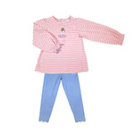 This two-piece set pairs a striped long-sleeve top with solid blue leggings for an effortlessly classic look. The ballerina appliqué adds a playful, graceful touch, while scalloped trim on the leggings brings that signature boutique charm. Soft and stretchy, this outfit moves easily through every twirl, crawl, or cuddle.