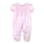 Featuring a delicate light pink interlock knit fabric with bishop smocking on the front making an outfit that is just simply sweet in every way.