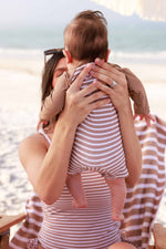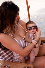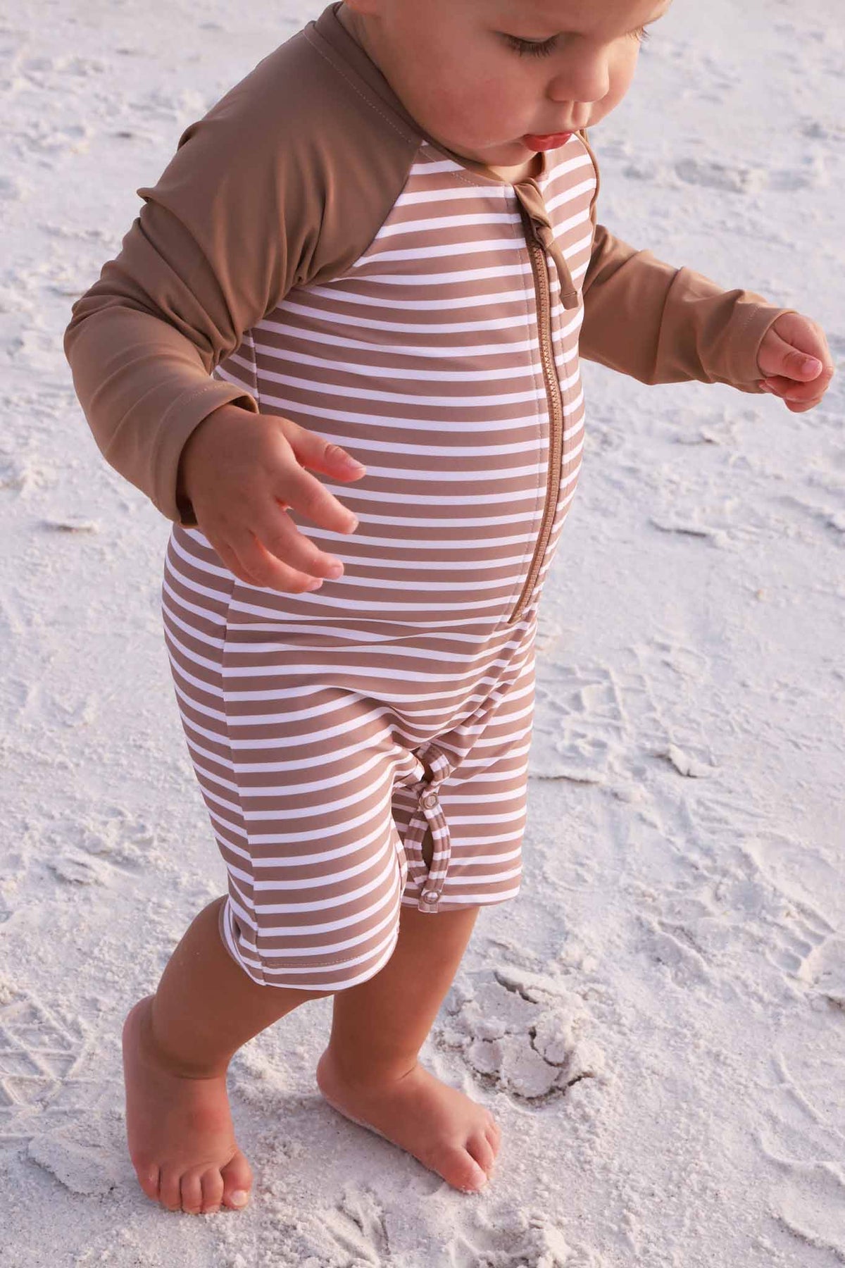 Made for sunny days with the whole family in matching stripes, the Sandy Stripes Long Sleeve Rash Guard Swim Romper Shortie is an easy favorite for little ones. Part of our family matching swim collection, this style features neutral stripes for a timeless beach look that coordinates perfectly with siblings and parents. Made from UPF 50+ fabric, it offers extra coverage for long days in the sun while still feeling comfortable and lightweight. The long sleeves help protect little arms, while the shortie length keeps