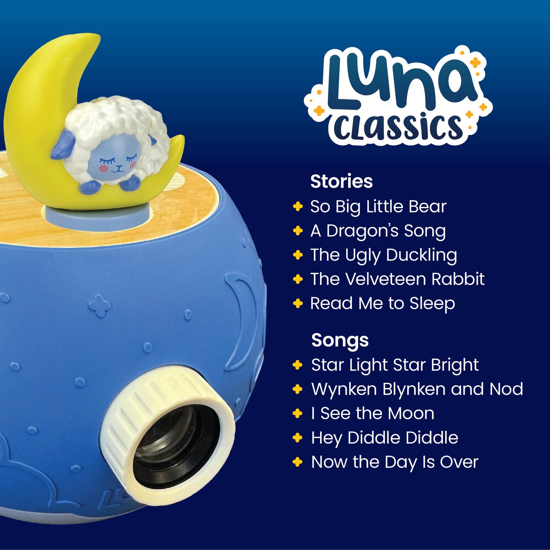 Transform bedtime into a peaceful, dream-filled adventure with the Luna Bedtime Stories sheep figurine for the Luna StoryTime Projector! This Luna brings charming bedtime stories to life, casting beautifully illustrated scenes onto the ceiling or walls, enveloping little ones in a world of warmth and imagination. With five beloved bedtime stories and four calming songs, this Luna offers over 30 minutes of soothing storytelling and relaxation, making wind-down time both comforting and delightful.