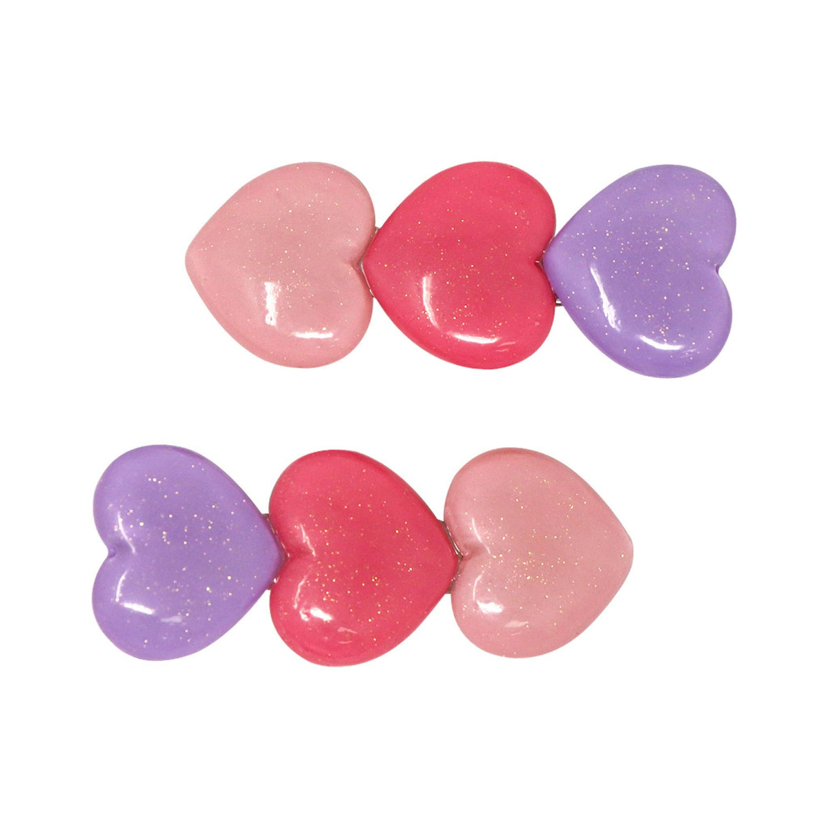 Pink Poppy's Glitter Hearts Alligator Clip Set includes a set of two 2 large barrette style hair clips in gold metal and adorned with 3D bubbly acrylic hearts. Finished with a sparkle resin look the pretty pastel hues add a sweet heart look to any hairstyle.