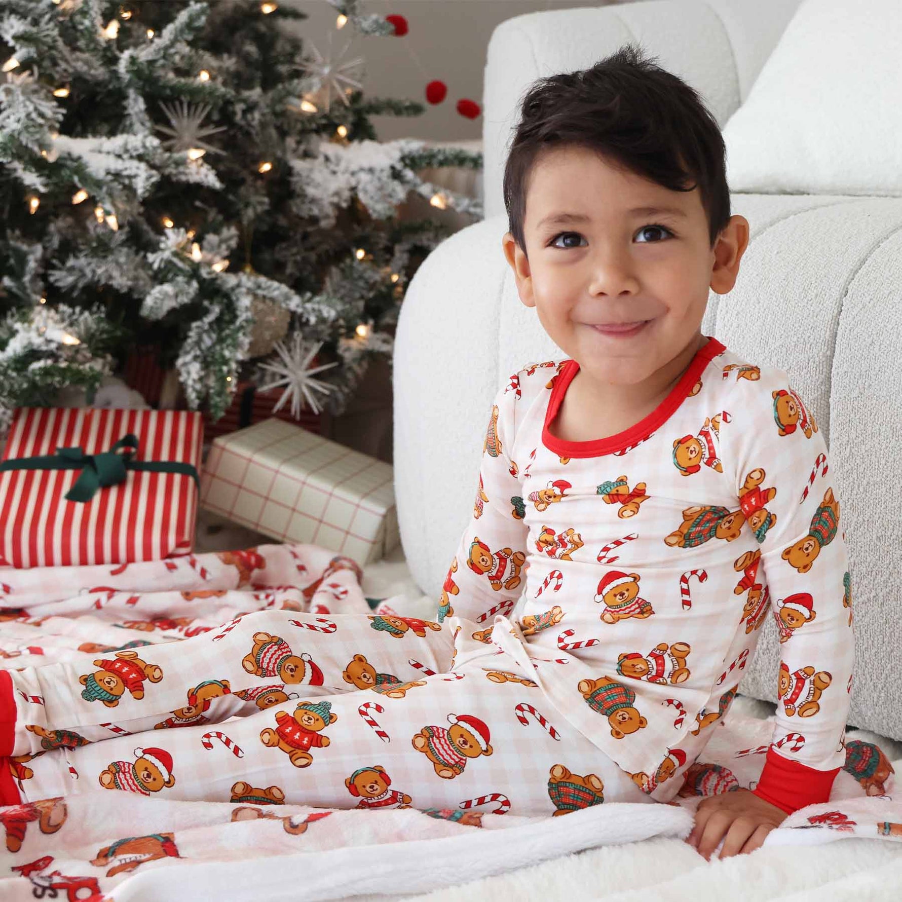Two Piece Pajama Set Details: * 95% Bamboo Viscose | 5% Spandex * Breathable bamboo ideal for sensitive skin * True-to-size * Set Includes: 1 Long Sleeve Top & Pant * For child's safety, this garment should fit snugly. This garment is not flame resistant. Care Instructions: * Machine Wash Cold - Gentle Cycle * Phosphate Free Detergent Recommended for Color Care * Wash with like fabrics (bamboo only) * Layette should be washed inside out * Line Dry / Air Fluff * Do NOT use Fabric Softener Make Christmas mornings even cozier with our Beary Christmas Two-Piece Pajama Set! This cheerful print features teddy bears dressed in festive sweaters, Santa hats, and ear muffs, all surrounded by candy canes and holiday cheer on a warm gingham backdrop. Made from buttery bamboo fabric, these pajamas are soft, stretchy, and breathable, keeping kids comfy through tree trimming, cookie decorating, and unwrapping presents. The long-sleeve top and matching bottoms are designed for all-night comfort and al
