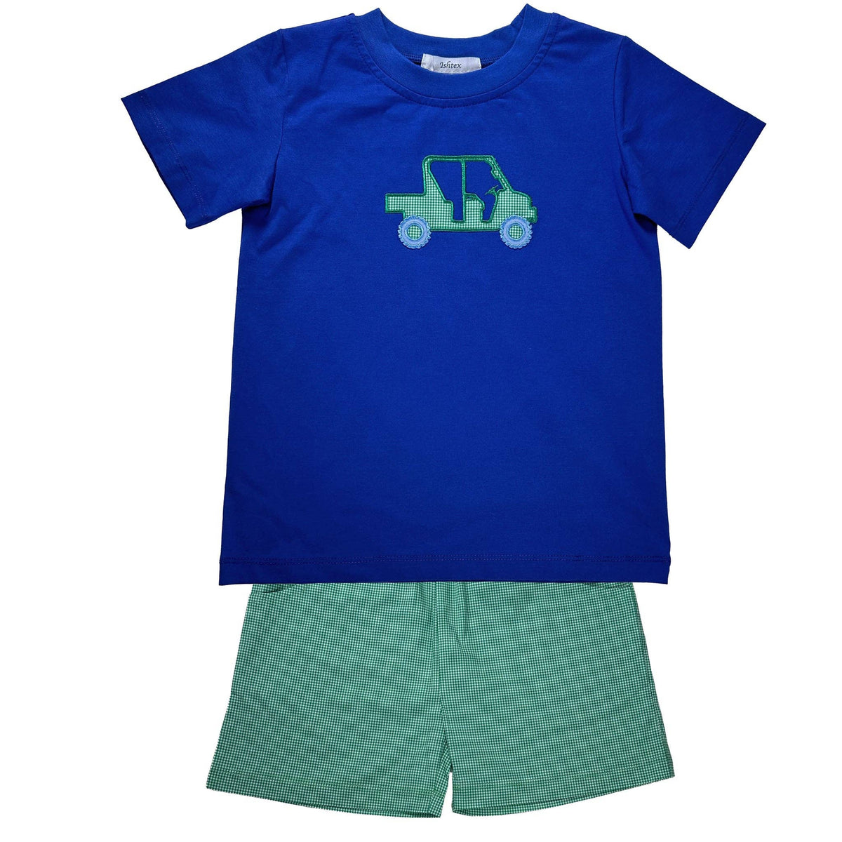 Get ready for endless summer fun with the Side By Side Boy's Shorts Set, designed to keep your little adventurer both stylish and comfortable. This set features a dark blue short-sleeved shirt adorned with a vibrant green plaid ATV applique, perfectly paired with matching green plaid shorts. It's an ideal choice for active little boys who are always on the move, whether they're playing in the park or attending a family gathering.