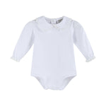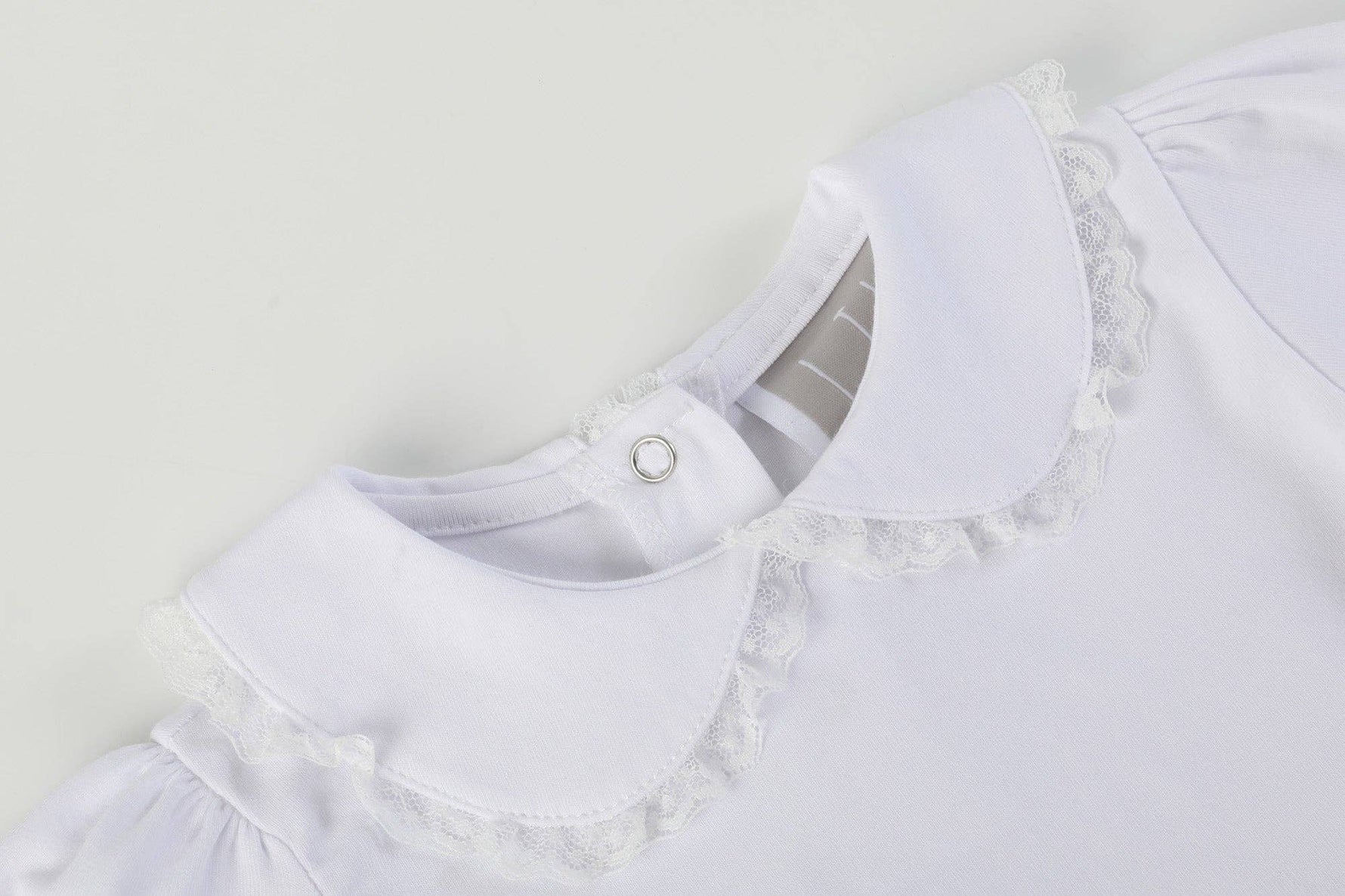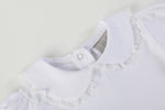 The perfect basic staple for your little sweetie's closet. A beautiful long short sleeve bodysuit made in the softest cotton. Detailed with a pretty lace trimmed collar to make it the perfect option for under rompers, overalls or even on its own. This collared romper is also great for embroidery and monograms to make it a one-of-a-kind look. Sizing goes up to 2T.